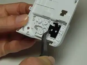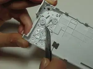 Пинцетом снимите любую необходимую кнопку, потянув за пластиковые полоски вблизи точки соединения с задней панелью.