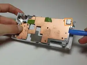 Если панель ранее не снималась с камеры, она будет прочно приклеена к задней панели и потребует некоторого усилия для удаления. Чтобы не повредить заднюю панель, работайте пластиковой лопаткой под разными участками металлической пластины, пока она полностью не отойдёт.
