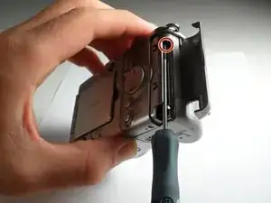 В других версиях этой камеры имеется защёлка, фиксирующая верхнюю часть от ремешка для запястья. Если у вашей камеры она есть, вы не сможете полностью отделить верхнюю часть, пока не вывернете верхний винт в Шаге 8.