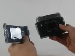 Когда объектив направлен от вас, есть кнопка в центре защелки с правой стороны. Нажмите эту кнопку пальцем и сдвиньте защелку вниз. Это отсоединит защелку, открывая заднюю часть камеры.