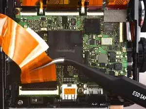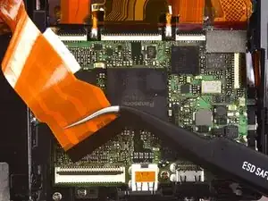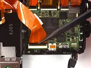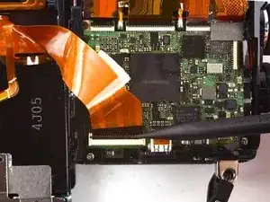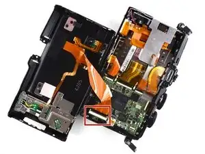 Чтобы отсоединить ленточный кабель, фиксирующий заднюю крышку к камере, используйте заострённый конец лопатки, чтобы откинуть верхнюю планку ZIF-коннектора.
