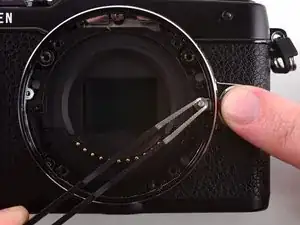 Нажмите и удерживайте кнопку сброса объектива, одновременно используя пинцет, чтобы снять защёлку объектива.