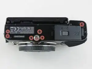 Используйте крестовую отвёртку Phillips #00, чтобы снять шесть винтов 2 мм на днище камеры.