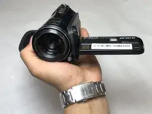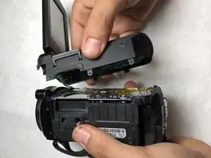 Разделите камеру на две части, оттянув сторону с экраном от основного корпуса камеры.