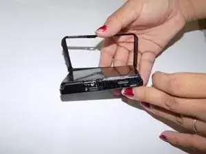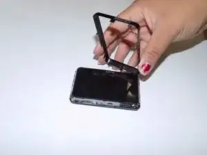 Правая рукой аккуратно оттяните назад металлическую раму задней панели устройства.