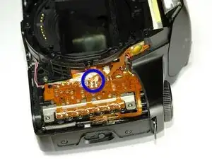 Отпаяйте соединение вспышки от материнской платы, как указано синим кругом.