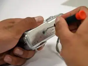 Вывинтите винт Phillips #00 длиной 5 мм снизу фотоаппарата.