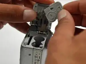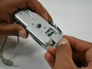 Вывинтите винт Phillips #00 длиной 4 мм внутри крышки, скрывающей отсеки для батареи и карты памяти.