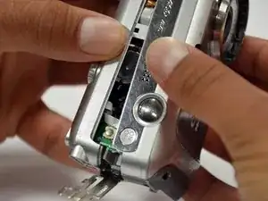Удалите винт Phillips #00 длиной 4 мм, который находится на левой стороне фотоаппарата, если экран обращён к вам.