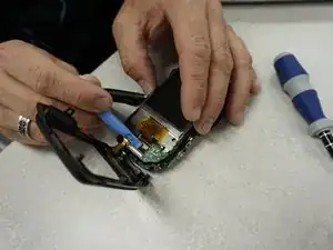 Аккуратно приподнимите чёрную фиксирующую планку ленточного кабеля, чтобы освободить его от платы устройства и тем самым отсоединить ЖК-экран от платы.