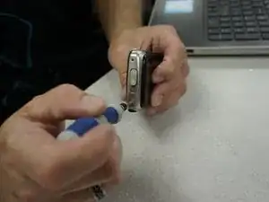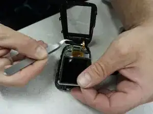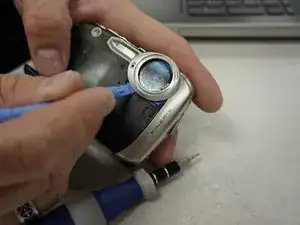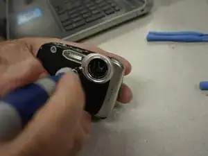 С помощью пластикового инструмента аккуратно подденьте корпус и снимите его с камеры.