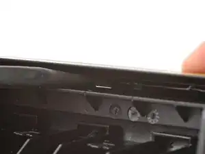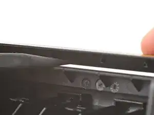 Вставьте кончик пластикового инструмента между одним из внешних краёв лотка защитного экрана и пластиковой посадочной.