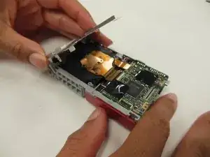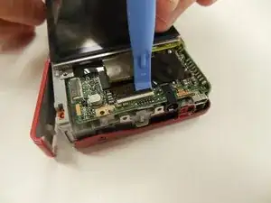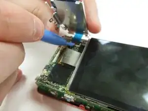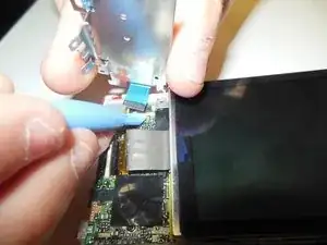 С помощью пластиковой лопатки аккуратно поднимите зажим шлейфа, как показано, чтобы отсоединить шлейф экрана от материнской платы.