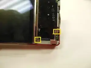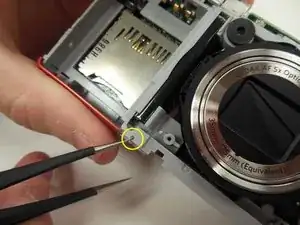 Снимите два винта длиной 3,85 мм в правом нижнем углу камеры, как показано.