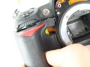 В моделях D7100 имеется дополнительный винт, удерживающий заднюю панель. Он расположен в окулярной шкале (диске с обозначениями + и –). Добраться до этого винта можно, сняв наклейку с окулярной шкалы.