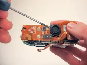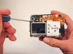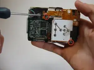 Используя отвертку Phillips #00, снимите два винта, фиксирующие корпус электрической плёнки на задней части камеры.