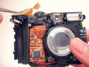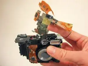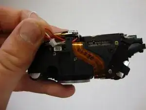 Переверните камеру на сторону, где ранее находился ЖК-экран. Найдите электрическую плёнку у верхней части камеры.