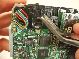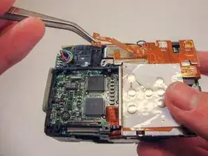 Держа камеру уверенно, аккуратно потяните конец электрической плёнки с задней части камеры пинцетом.