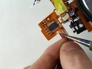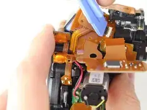 Осторожно отогните лентовый кабель в нижнем левом углу камеры.