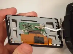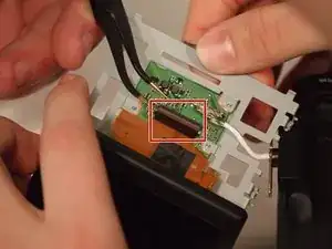 Теперь, когда шлейф отключён, осторожно снимите плату и отложите её в сторону. Эта деталь всё ещё работоспособна, поэтому оставьте её прикреплённой к камере.