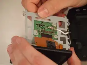 Внутри корпуса находятся несколько компонентов: плата, питающий кабель, экран и гибкий шлейф. Сначала, используя пинцет, приподнимите металлический зажим, соединяющий шлейф с платой.