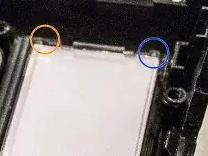 Теперь положите прозрачную пластину поверх нового дисплея. УБЕДИТЕСЬ, что она установлена в правильной ориентации. На изображении синий вырез немного больше оранжевого.