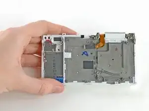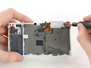 Используйте отвёртку Phillips №00, чтобы удалить два 5-мм винта, удерживающих блок вспышки в корпусе камеры.