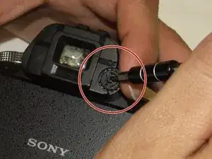 На верхней части камеры находится черная пластиковая наклейка, скрывающая два винта, которые необходимо удалить.