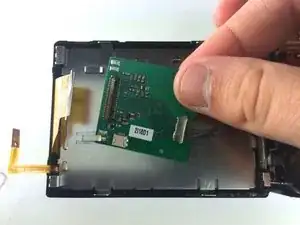 Используйте пинцет с изогнутым наконечником, чтобы аккуратно вынуть зелёную печатную плату из-под двух держателей, удерживающих её на месте. Затем снимите её полностью пальцами.