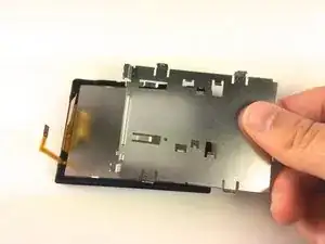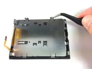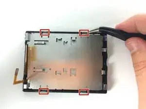 С помощью пинцета с изогнутым наконечником отсоедините металлическую пластину, удерживающую экран на месте. Потребуется отсоединить четыре защёлки.