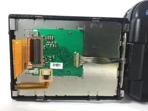 Найдите оранжевый шлейф, соединяющий заднюю крышку с платой ввода-вывода в правом нижнем углу камеры (объектив направлен от вас).