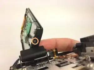 Поверните экран против часовой стрелки, как показано, и снимите один винт Phillips #000 длиной 2 мм на внутреннем крае внутренней рамки ЖК-экрана.