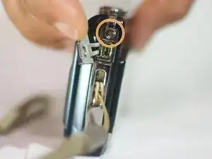 После снятия серебристой детали, к которой был прикреплён шнурок, найдите и удалите винт.