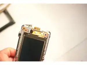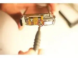 Повернув камеру лицом к ЖК-экрану, удалите три винта сразу справа от экрана. Они расположены рядом с гибкими шлейфами, соединяющими ЖК-экран с материнской платой.