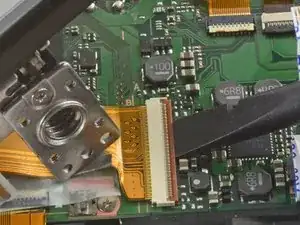 Чтобы снять ленточный кабель, отогните оранжевую фиксирующую защёлку на большом ZIF-разъёме плоским концом лопатки.