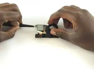 Вставьте металлическую монтажную лопатку между задней пластиковой крышкой и узлом платы камеры. Обходя по периметру и остерегаясь внутренних компонентов, аккуратно извлеките камеру.