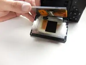 Разложите ЖК-экран и переверните камеру вниз к верху, чтобы получить доступ к винтам на дне.