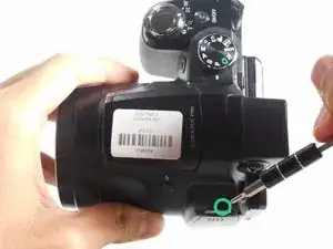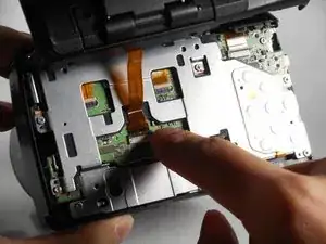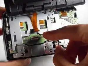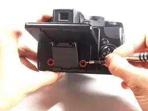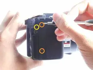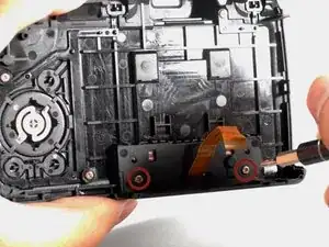 НЕ снимайте заднюю крышку полностью с камеры пока. Существует шлейф передачи данных, соединяющий ЖК-экран с материнской платой.