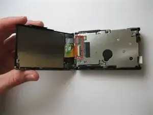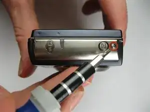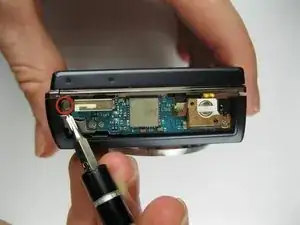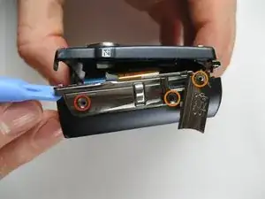Уберите винт 5x3 мм, фиксирующий панель на стороне, ближайшей к объективу.