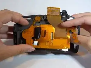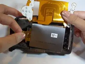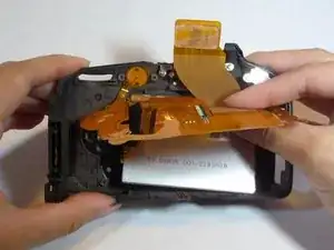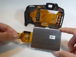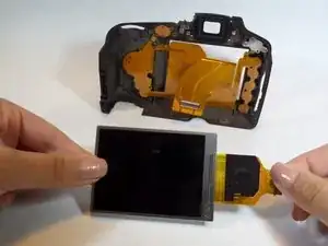 Осторожно потяните заднюю часть камеры: одной рукой удерживайте корпус, другой — ЖК-экран.