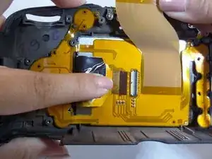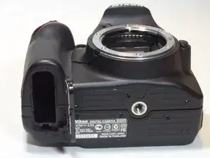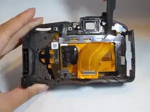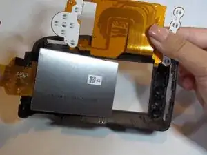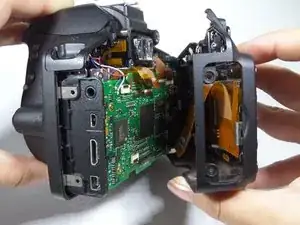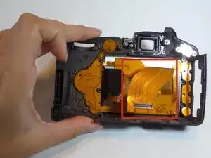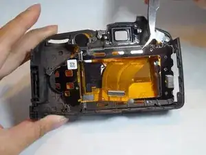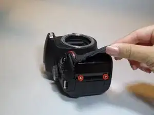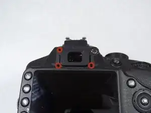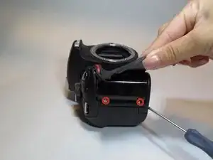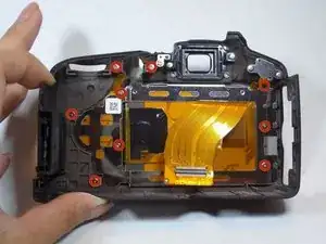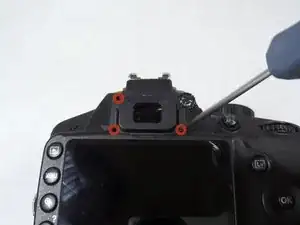 Найдите и извлеките 4 винта над ЖК-экраном, вокруг видоискателя. Осторожно подденьте лезвием наклейку на колёсике +/- чтобы открыть винт под ней.