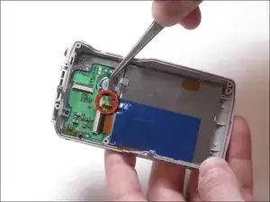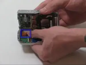 Шлейф платы присоединён в верхнем левом углу корпуса. Будьте осторожны при разъединении передней и задней частей фотоаппарата.