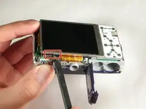 С помощью лопатки аккуратно приподнимите ЖК-экран, следя за тем, чтобы ленточный кабель остался целым.