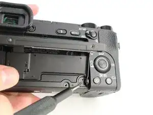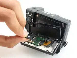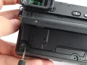 Для взаимодействия с камерой и доступа к её функциям важно иметь рабочий ЖК-экран. Если на экране наблюдаются искажения или мерцание, он может быть повреждён и требовать замены. В этом руководстве показано, как разобрать камеру и извлечь ЖК-экран; избегайте порчи плоских шлейфов, оголённых в процессе. При снятии экрана с пластикового каркаса клей, которым он прикреплён, будет разрушен. При желании можно приклеить заменяемый экран к каркасу с помощью любого цианоакрилатного или эпоксидного клея. Для выполнения этого руководства потребуются отвертки JIS 00 и 000, инструменты для вскрытия, лопатка и пинцет.