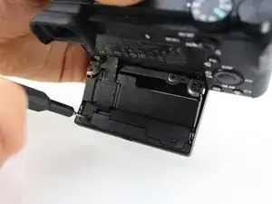 Чтобы получить доступ к узлу ЖК-экрана, необходимо снять винты, крепящие его петлю к корпусу камеры.