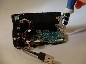 Ориентируйте камеру на сторону, противоположную кнопкам записи, где был кожаный ремешок. Найдите оранжевую плату и снимите три ближайших черных винта 5 мм и серебряный винт 4 мм.