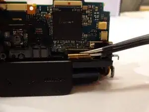 Пинцетом аккуратно отсоедините черный и белый провода, подключённые к нижней части платы рядом с панелью объектива.