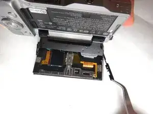 Используя пинцет, осторожно потяните маленький оранжевый язычок от задней панели.