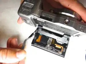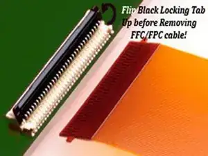 Используйте лопатку или пластиковый инструмент для открытия, чтобы поднять чёрный замковый язычок. Выдвиньте кабель прямо из гнезда и удалите дисплей.