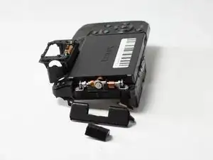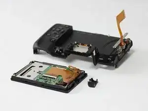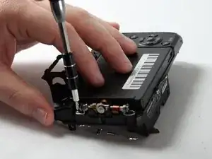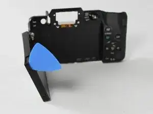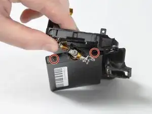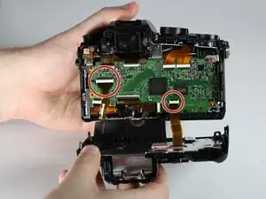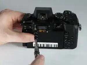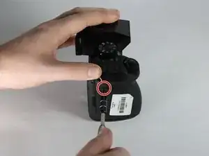 Удалите два указанных серебристых винта длиной 3,5 мм, расположенных рядом с экраном видоискателя, используя отвертку PH0 Phillips.